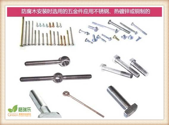 五金件應用不銹鋼、熱鍍鋅或銅制的,主要避免日后生銹腐蝕,并影響連接牢度。連接安裝時請預先鉆孔,以避免防腐木開裂。